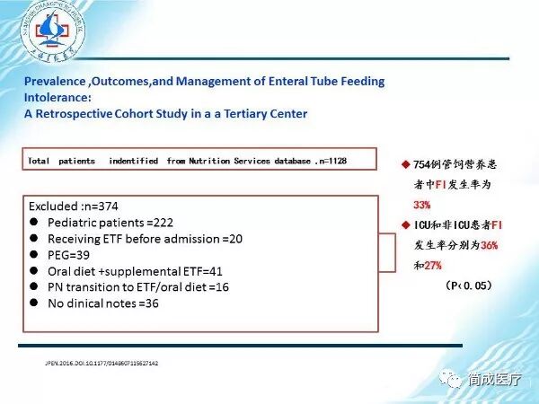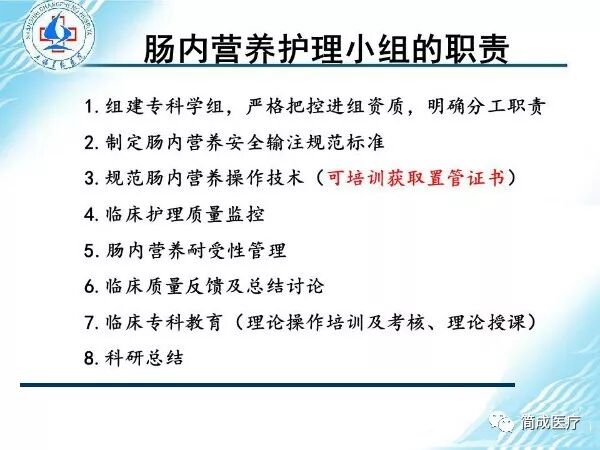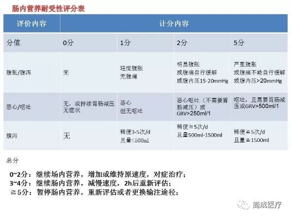 2018年6月26日简成医疗开展了每月的微信分享会,此次会议邀请的嘉宾是海军军医大学附属长征医院的邵小平护士长,分享的主题是:“肠内营养护理小组的运作及安全管理”。 第二军医大学附属长征医院急救科ICU护士长 中华医学会肠外肠内营养分会护理学组委员 中华医学会感控分会重点部位学组委员 全军重症医学专委会护理学组副主任委员 上海重症护理专委会委员 上海感控护理专委会秘书 肠内营养在临床上逐渐重视起来是与医学的发展密切相关,肠内营养可以为患者及时提供营养,保证生命所需营养。 那么想要肠内营养为患者带来更大的效益,那么肠内营养护理小组的运作及安全管理的建立就显得尤为重要。 邵老师便是一直在尝试和实践如果有效的运作肠内护理小组的一位临床护士长,通过不断的考察、实践、反思,最终成了一套比较有实际意义的肠内营养护理小组的运作的体系。 长征医院 邵老师所在长征医院也是在肠内营养方面很有建树,肠内营养多个培训基地、示范病房、置管专职护士这些都是走在肠内营养建设的第一线,是众多医院学习的典范。 小编根据邵老师的分享,摘抄了一些重点供大家参考和学习。 · 正 · 文 · 来 · 啦 · 为什么我们会把肠内营养来作为护理近十年的主攻方向,其实我在2008年之前主攻方向是气道管理。因为我觉得在ICU当中,我们护理能把气道管理做好能够被获得认可的。 而我们的这肠内营养从九十年代末期开始来进行这个配方。因为最早咱们用的都是医院的自制的,比如说像匀浆膳食之类的。但是临床发现一个问题就是上面滴的很快,下面流的速度也很快,这就是我们护理存在的一个胃肠不耐受的表现,尤其是以腹泻为主。 从左边的数据可以看出,肠内营养进行当中,胃肠不耐受性的发生率在ICU和非ICU没有明显的差异。 也就是说我们作为肠内营养的护理。在ICU和非ICU,都是我们每个护理的重点。 ASPEN 、ESPEN、CSPEN、JSPEN 、AUSPEN等这些研究,对鼻肠管的置入和维护,对营养液的配制的技术,输注的技术,包括耐受性的管理和营养相关的知识等等都作了相当多目标性的一些监测,可以给到一些建议和临床实施的一些措施。 【思考】 护士是否有主攻方向 作为ICU的专科护士,需要去了解先进的设备、仪器、每一种疾病的护理、每一个脏器系统的监测。但是我们有没有想过,比如说作为一个神经内科的医生,他也是有自己的主攻方向,比如说癫痫、睡眠障碍等,那同样的重症护理是不是也一样应该有自己的主攻方向? 想要建立肠内营养小组,就必须要明确职责,做好每一份安排的工作。在失败中找经验,不断的调整,不断的进步。 科室的护理学组分成6个专组,每一个护士都会有自己的一个主攻方向。也就是说她需要掌握重症护理的每一个环节,同时在工作的期间她除了完成自己病人的护理之外,她还要去进行督导自己所在的专业学组。 【质控】 肠内营养护理小组的互查 临床质控表的目的在于及时发现临床问题,并予以纠正,所以采用互查的方式进行,但是不与绩效奖金挂钩。 通过对表格这些内容的讲评,每天都有这一张表,我们都会有一个周总结,每个月有个月总结。 月总结的时候,组长需要对全科的人员进行讲评,比如说这一个月好的在哪里,存在的问题在哪里,我下个月的整改措施,重点是在哪里。 NRS2002在一个普通病房来说,评估出来还是会存在有阳性和阴性的病人。一旦进入重症病人的评估的时候,人人都是阳性,但是无法区分谁重谁轻。但是2016年NUTRIC评分当中,它就给到我们一个很好的诠释。 当完成评估以后,如果存在营养风险的不良,我们可能就会进入到肠内营养的喂养流程。 喂养流程,我们也去看看临床我们实施的到底如何? 比如说像血流动力学的稳定性,血压它要求平均动脉压在六十五个毫米汞柱,血管活性药物在逐步的撤离过程当中。我们试想一下,我们每个病人是不是都在测血压,但是测血压你护士都只关注了收缩压、舒张压,你平均动脉压去关注了吗?尤其在监测的数据当中,我们记录了吗? 如果AGI分级在一到三级之间,是可以进行肠内营养。如果可以进行肠内营养,根据喂养流程,我们就要进入到下一个环节,去评估患者有没有误吸的风险。 因为影响胃排空的因素非常多,那么我们经常什么时候给予肠喂养,什么时候给予胃喂养?当然我们除了一些疾病的本身的因素,比如说像一个急性胰腺炎的患者,这一类的病人必须过幽门后进行喂养。而其他的病人,似乎我们在临床还没有一个统一的一个标准,可能我们各个地方掌握的标准都不会一样。 上面是关于肠的营养耐受性的评分表。肠内营养的这个耐受性的一个评分,是需要喂养以后才能去评分。如果我们一旦评估出来,这个患者是存在误吸风险,病人有一些吞咽功能障碍,存在的胃排空的比例比较高,那么我们在这个选择是胃喂养还是肠喂养。如胃喂养,那我就要关注的就是我后面的监测点。如果是肠喂养我们就涉及到怎么来进行置管的问题。 一旦进行肠内营养的时候,不仅要对耐受性的评分,更重要的可能还是在一个腹部,比如说像腹泻,腹胀,还有误吸和代谢性并发症相关。 所谓术业有专攻,肠内营养护理小组的建立及运作都是在为肠内营养方面做了很大的突破,打破了常规认为护士并不没有专攻的方向。明确了职责,病人肠内营养的评估、监测就能得到更